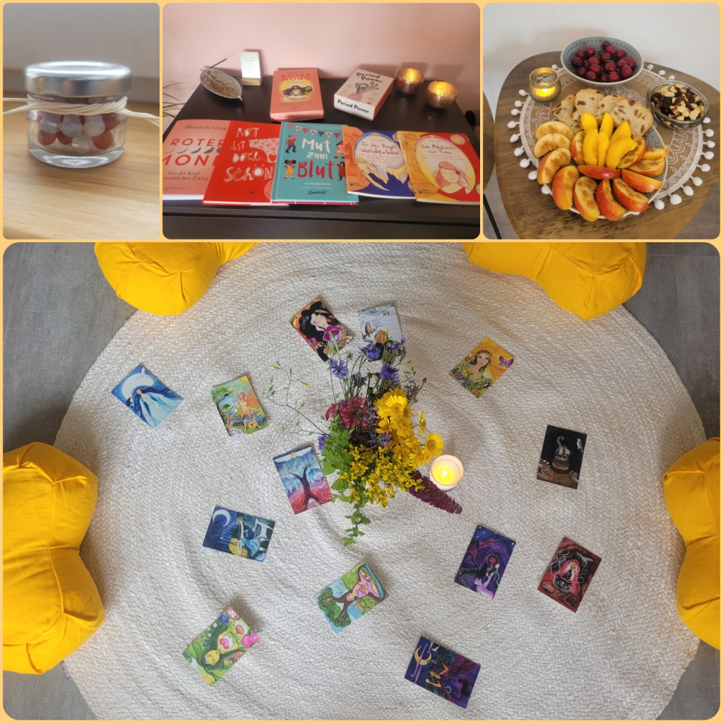In meinen Workshops nehme ich Mädchen zwischen 11 und 13 Jahren mit einer Geschichte auf die Reise eines Mädchens, das seine Menarche ganz besonders erlebt, von einer Gemeinschaft von anderen Frauen und Mädchen dafür gefeiert und in die Geheimnisse des weiblichen Zyklus eingeweiht wird.